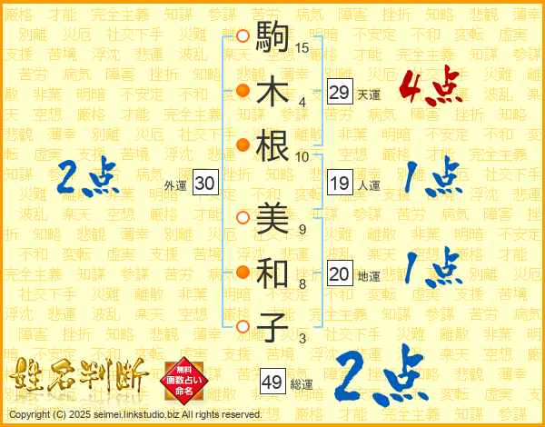 駒(15画)木(4画)根(10画) 美(9画)和(8画)子(3画)