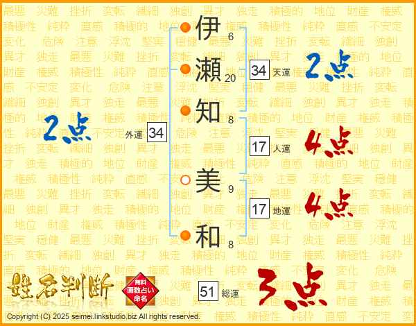 伊(6画)瀬(20画)知(8画) 美(9画)和(8画)