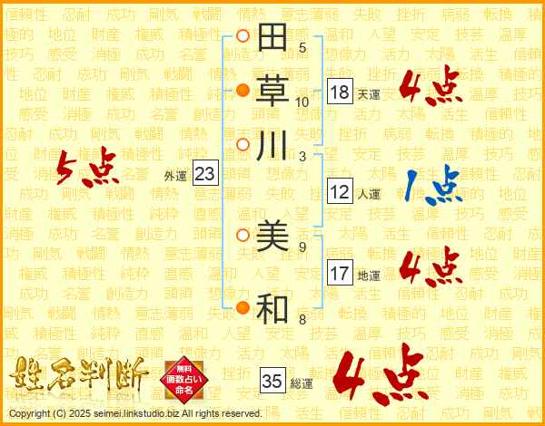 田(5画)草(10画)川(3画) 美(9画)和(8画)