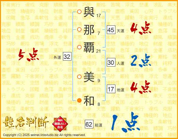 與(17画)那(7画)覇(21画) 美(9画)和(8画)