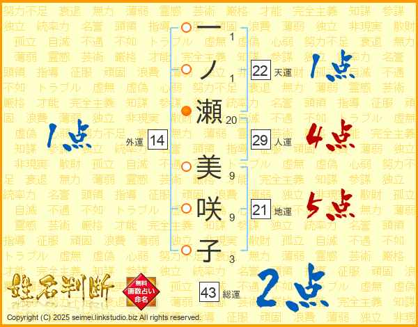 一ノ瀬美咲子さんの総運は43画の2点!