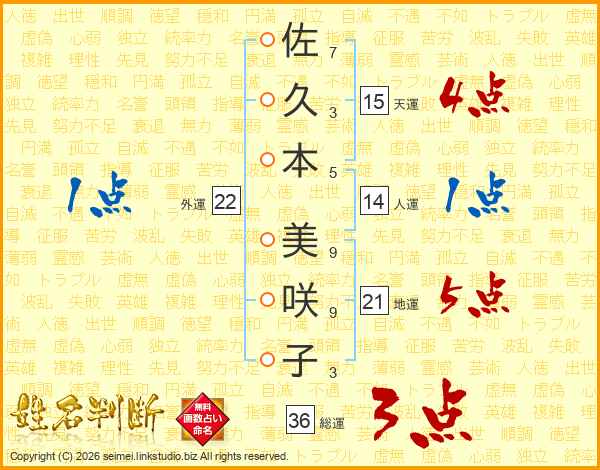 佐(7画)久(3画)本(5画) 美(9画)咲(9画)子(3画)
