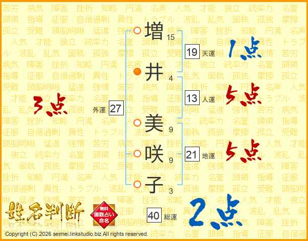 増(15画)井(4画) 美(9画)咲(9画)子(3画)