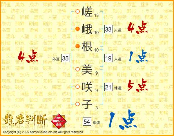 嵯(13画)峨(10画)根(10画) 美(9画)咲(9画)子(3画)