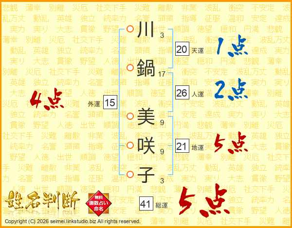 川鍋美咲子さんの総運は41画の5点!