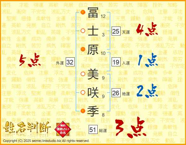 冨(12画)士(3画)原(10画) 美(9画)咲(9画)季(8画)