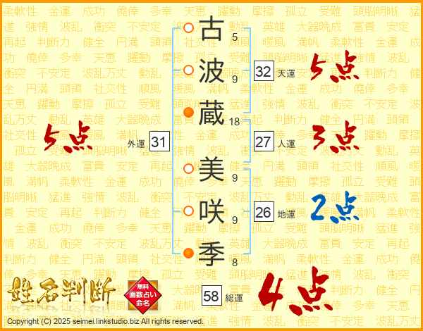 古(5画)波(9画)蔵(18画) 美(9画)咲(9画)季(8画)