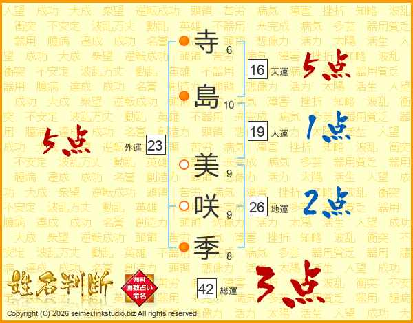寺(6画)島(10画) 美(9画)咲(9画)季(8画)