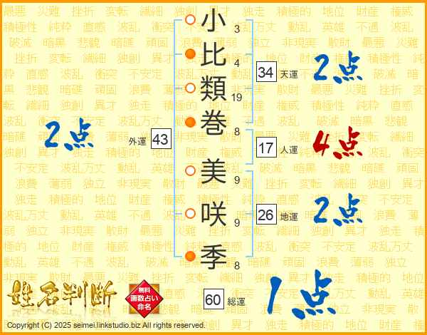小(3画)比(4画)類(19画)巻(8画) 美(9画)咲(9画)季(8画)