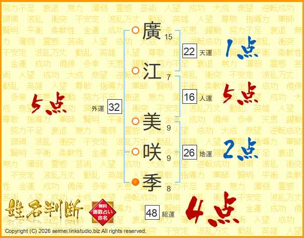 廣(15画)江(7画) 美(9画)咲(9画)季(8画)