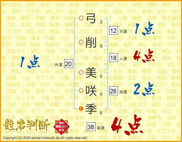 弓(3画)削(9画) 美(9画)咲(9画)季(8画)