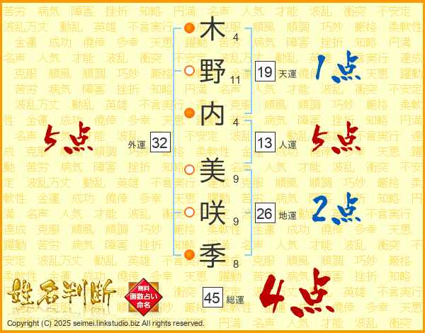 木(4画)野(11画)内(4画) 美(9画)咲(9画)季(8画)