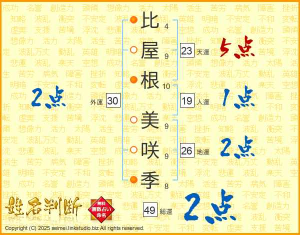 比(4画)屋(9画)根(10画) 美(9画)咲(9画)季(8画)