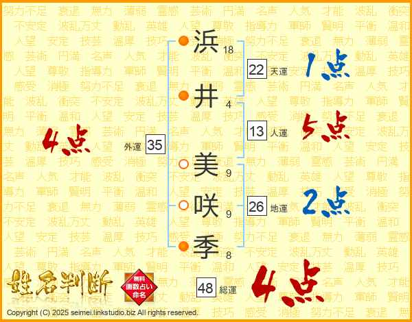 浜(18画)井(4画) 美(9画)咲(9画)季(8画)