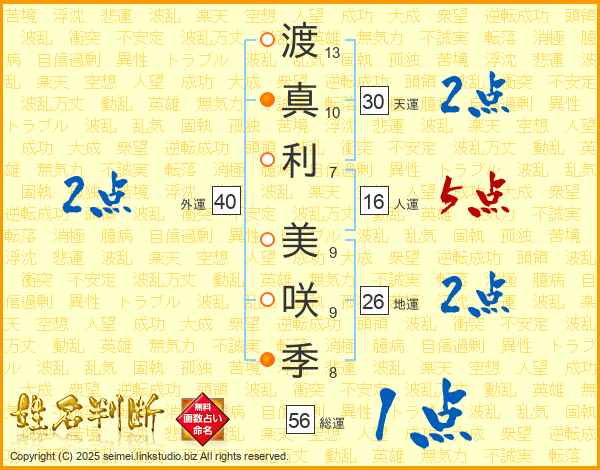 渡(13画)真(10画)利(7画) 美(9画)咲(9画)季(8画)