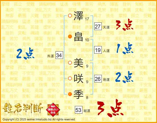 澤(17画)畠(10画) 美(9画)咲(9画)季(8画)