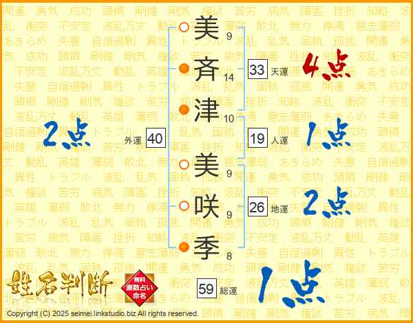 美(9画)斉(14画)津(10画) 美(9画)咲(9画)季(8画)