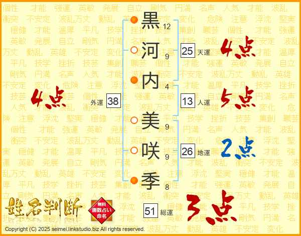 黒(12画)河(9画)内(4画) 美(9画)咲(9画)季(8画)