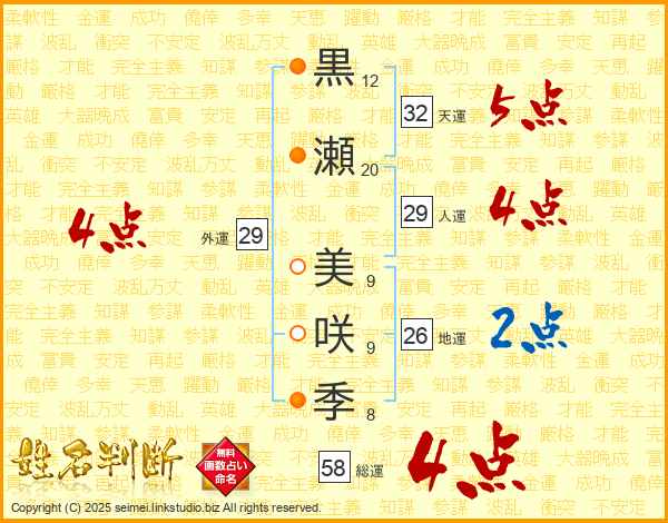 黒(12画)瀬(20画) 美(9画)咲(9画)季(8画)