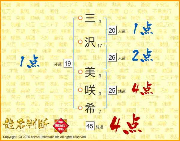 三(3画)沢(17画) 美(9画)咲(9画)希(7画)