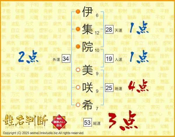 伊(6画)集(12画)院(10画) 美(9画)咲(9画)希(7画)