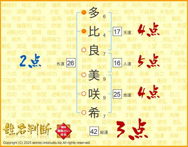 多(6画)比(4画)良(7画) 美(9画)咲(9画)希(7画)