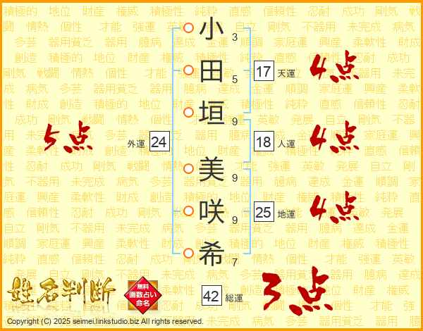小(3画)田(5画)垣(9画) 美(9画)咲(9画)希(7画)