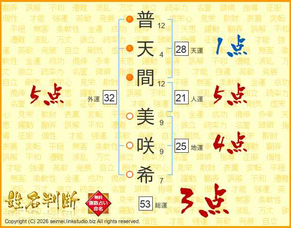 普(12画)天(4画)間(12画) 美(9画)咲(9画)希(7画)
