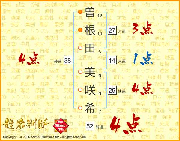 曽(12画)根(10画)田(5画) 美(9画)咲(9画)希(7画)