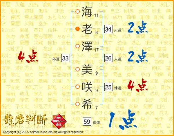 海(11画)老(6画)澤(17画) 美(9画)咲(9画)希(7画)
