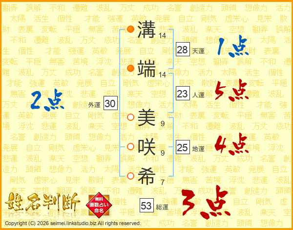 溝(14画)端(14画) 美(9画)咲(9画)希(7画)
