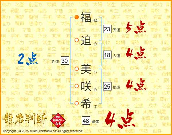 福(14画)迫(9画) 美(9画)咲(9画)希(7画)