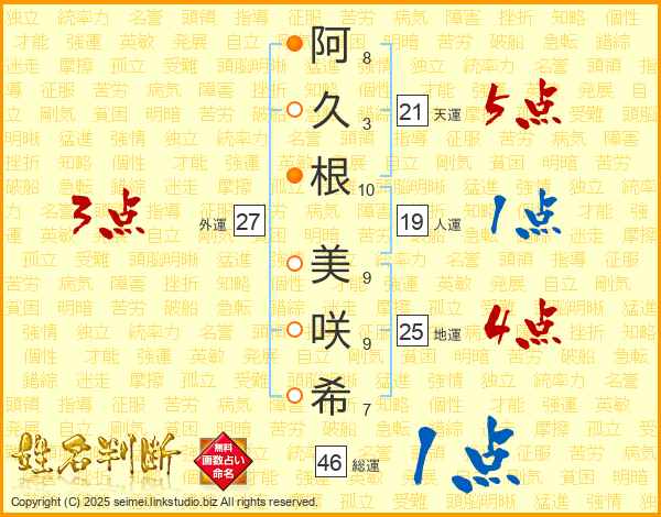 阿(8画)久(3画)根(10画) 美(9画)咲(9画)希(7画)