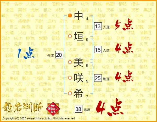 中(4画)垣(9画) 美(9画)咲(9画)希(7画)