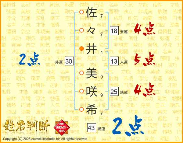 佐々井美咲希さんの総運は43画の2点!