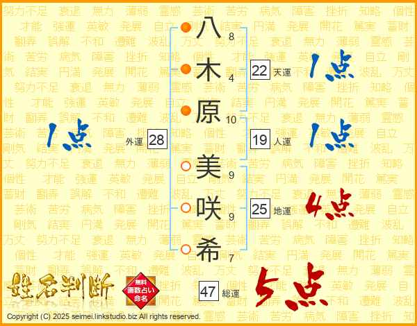 八(8画)木(4画)原(10画) 美(9画)咲(9画)希(7画)
