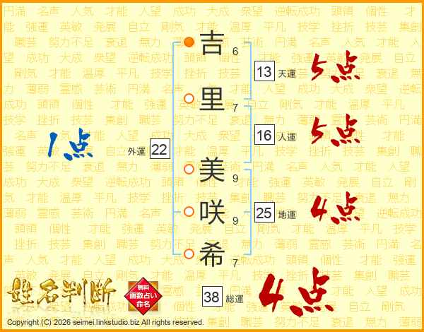 吉(6画)里(7画) 美(9画)咲(9画)希(7画)