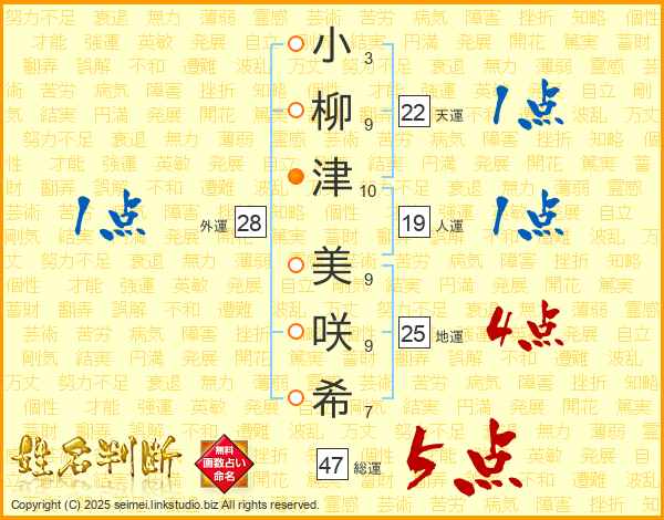 小(3画)柳(9画)津(10画) 美(9画)咲(9画)希(7画)