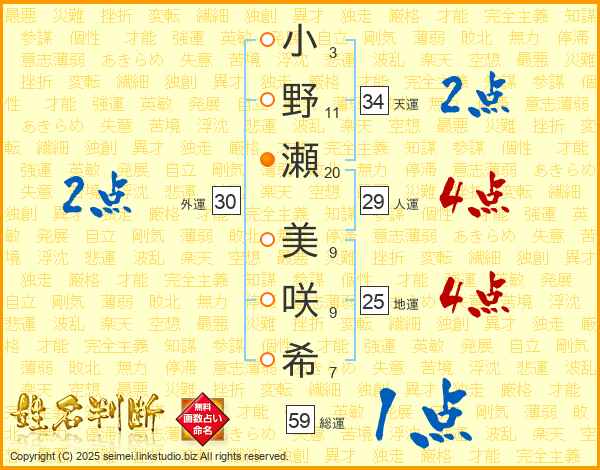小(3画)野(11画)瀬(20画) 美(9画)咲(9画)希(7画)