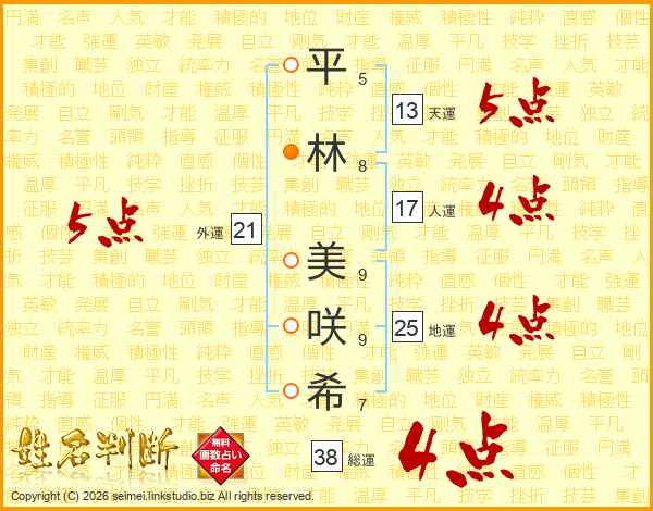 平(5画)林(8画) 美(9画)咲(9画)希(7画)