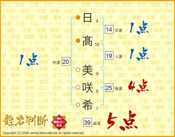 日(4画)髙(10画) 美(9画)咲(9画)希(7画)