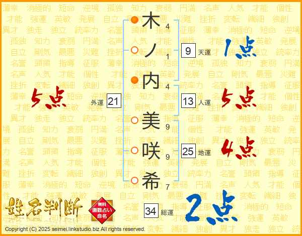 木(4画)ノ(1画)内(4画) 美(9画)咲(9画)希(7画)