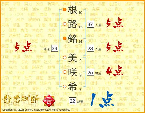 根(10画)路(13画)銘(14画) 美(9画)咲(9画)希(7画)