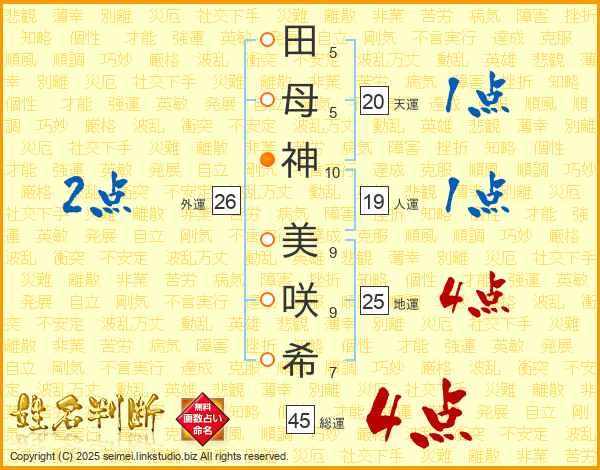 田(5画)母(5画)神(10画) 美(9画)咲(9画)希(7画)