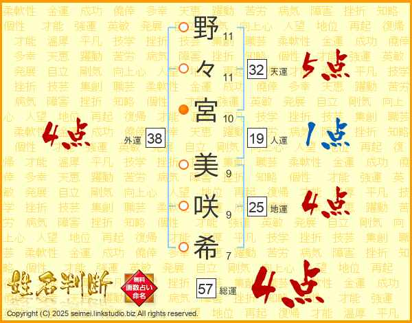 野(11画)々(11画)宮(10画) 美(9画)咲(9画)希(7画)