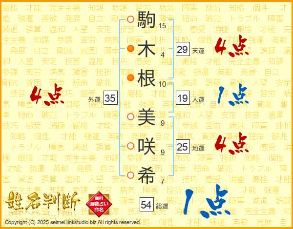 駒(15画)木(4画)根(10画)  美(9画)咲(9画)希(7画)