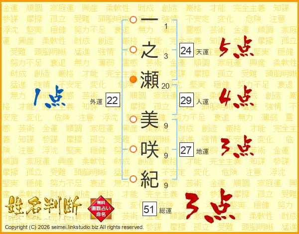 一之瀬美咲紀さんの総運は51画の3点!