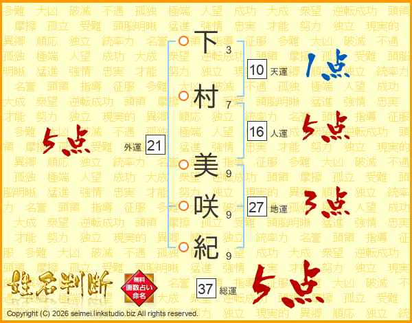 下(3画)村(7画) 美(9画)咲(9画)紀(9画)