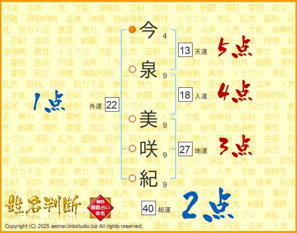 今(4画)泉(9画) 美(9画)咲(9画)紀(9画)