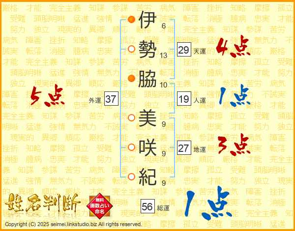 伊(6画)勢(13画)脇(10画) 美(9画)咲(9画)紀(9画)